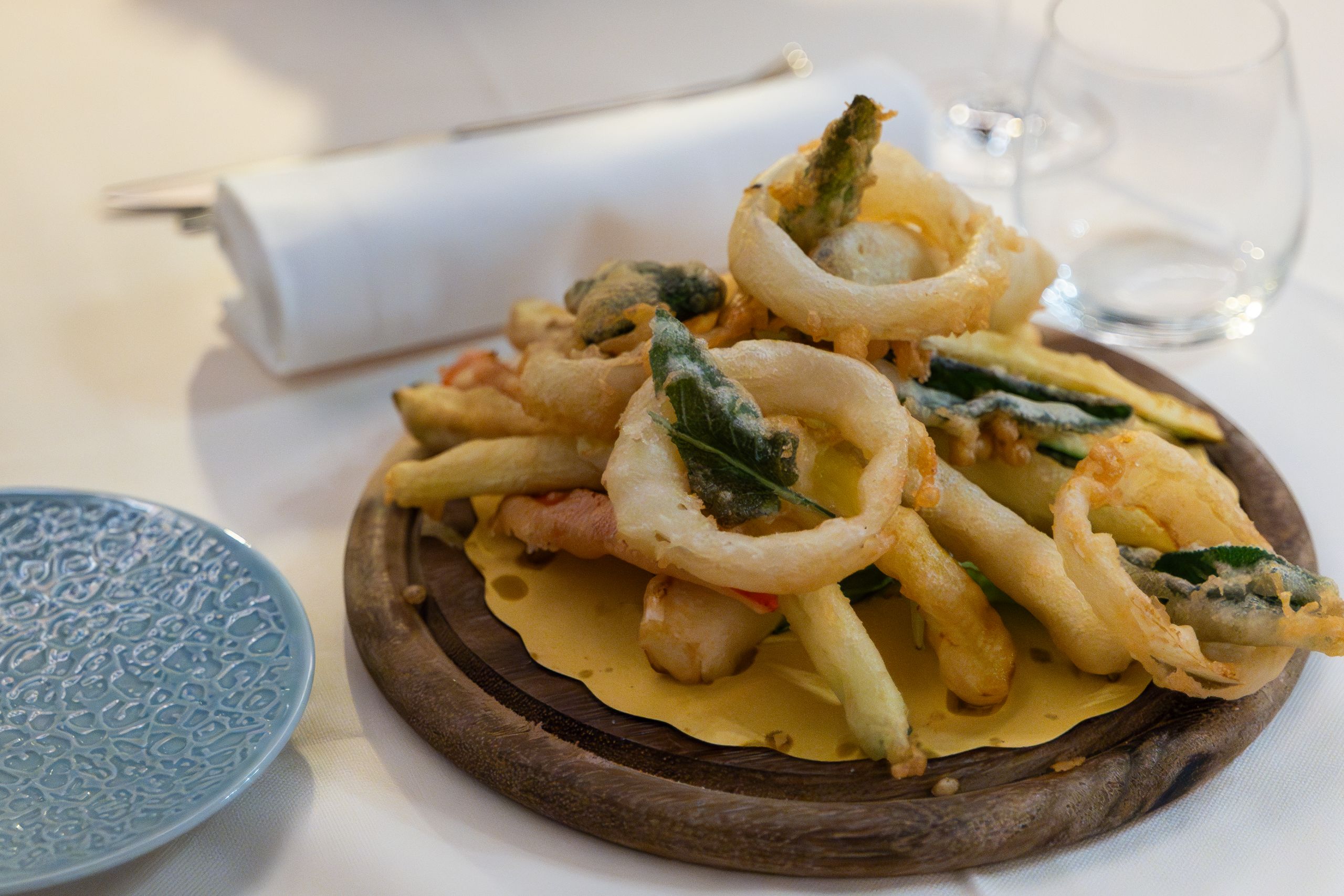 FIORI DI ZUCCA RIPIENI CON CAPRINO MORBIDO, TARTUFO NERO PREGIATO E TEMPURA (1,4,7) DI FARINA DI RISO€23